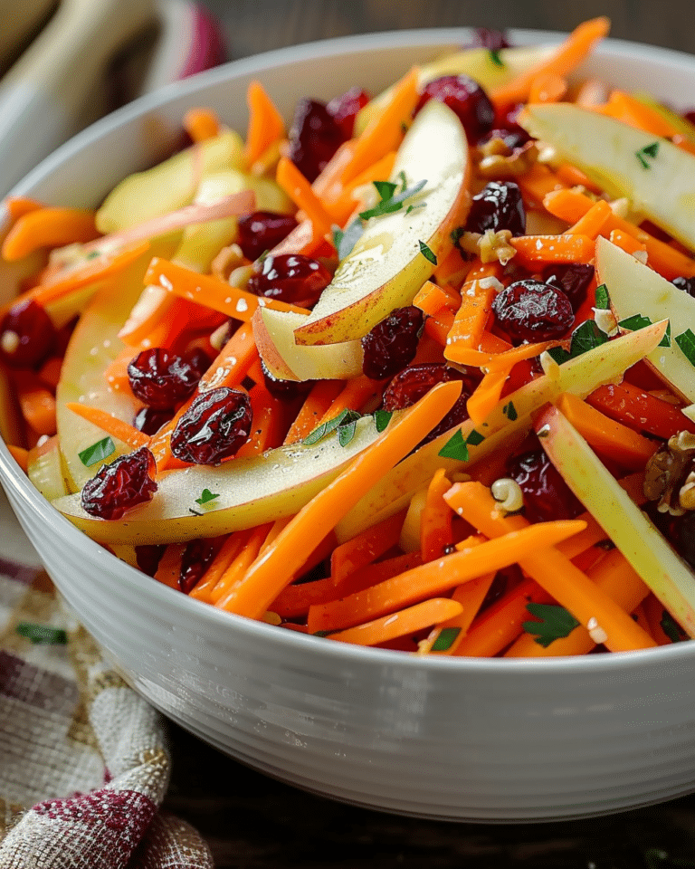 This vibrant Refreshing Apple Cranberry Carrot Salad is a refreshing combination of crisp apples, tangy cranberries, and fresh carrots, making it the perfect light snack or side dish. With a touch of honey, lemon juice, and a sprinkle of cinnamon, it’s bursting with flavor. Plus, you can top it off with crunchy walnuts or pecans to enhance the texture. Whether you’re looking for a healthy addition to your meal or something to snack on during the day, this salad has you covered!